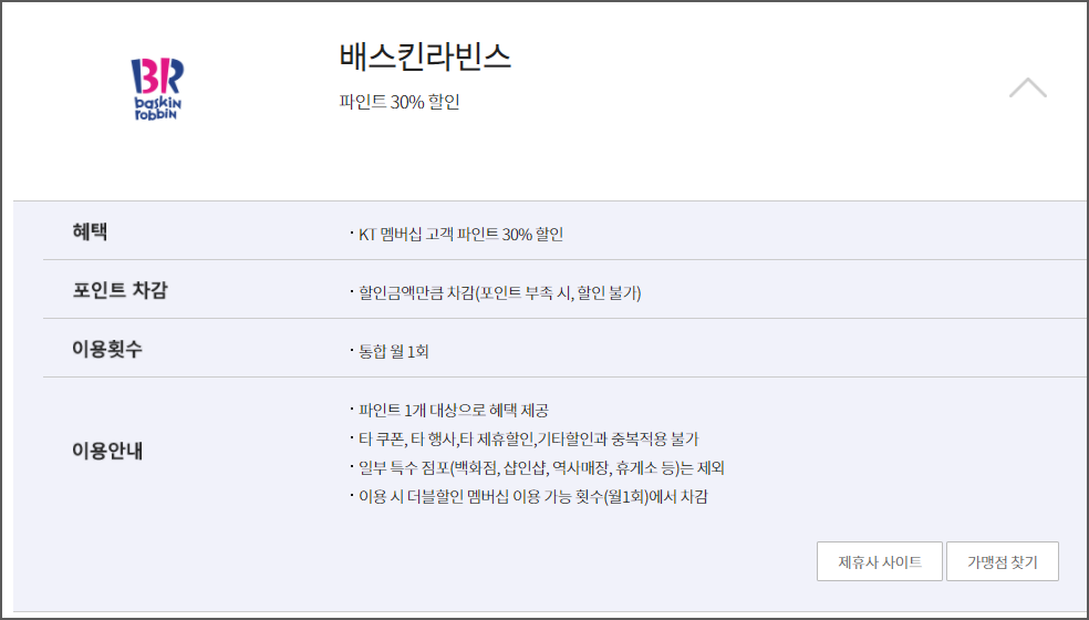 베스킨라빈스는 KT 회원이라면 15% 할인을 받는데