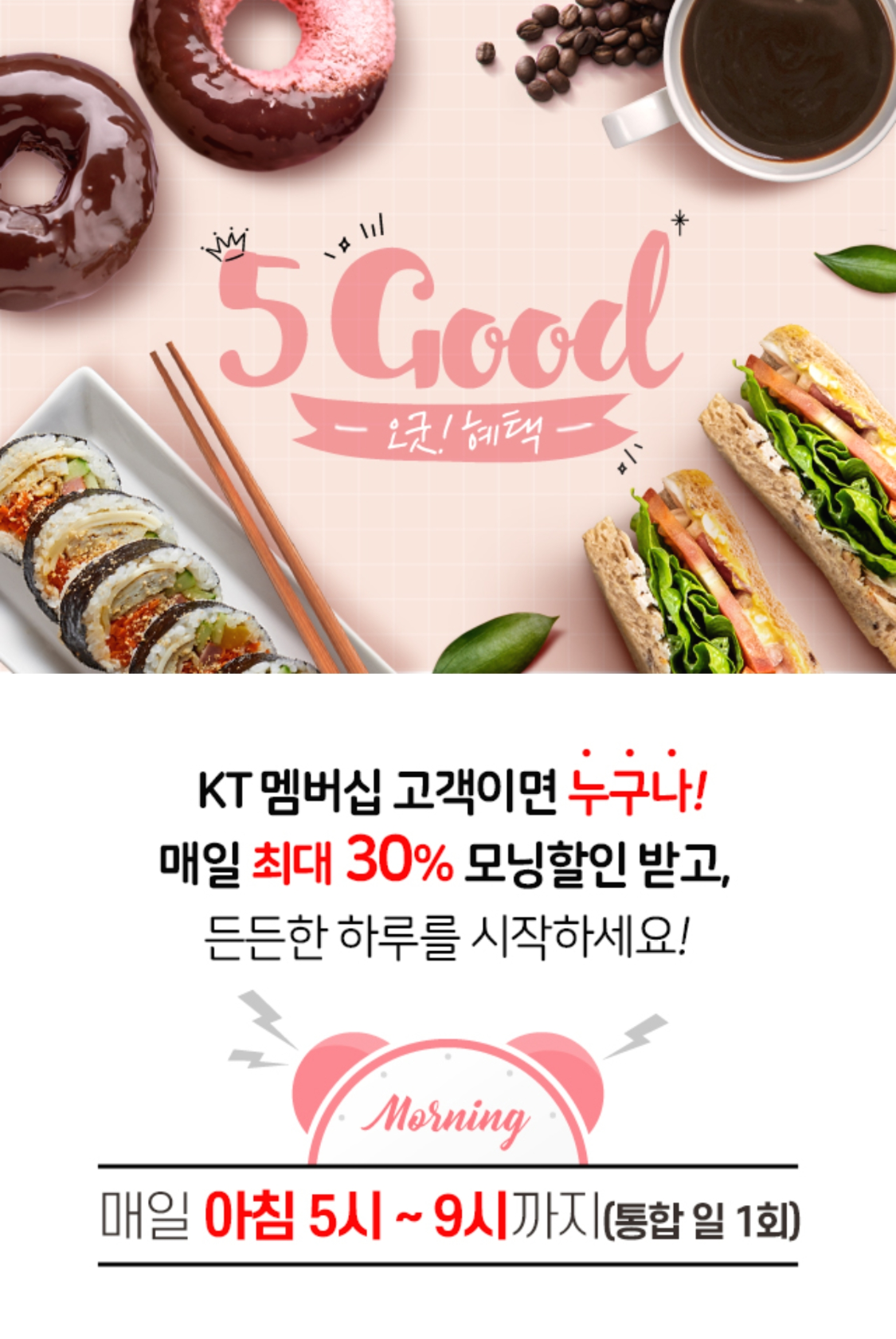 KT 5굿 모닝할인 김밥 햄버거 등 30% 할인 받자