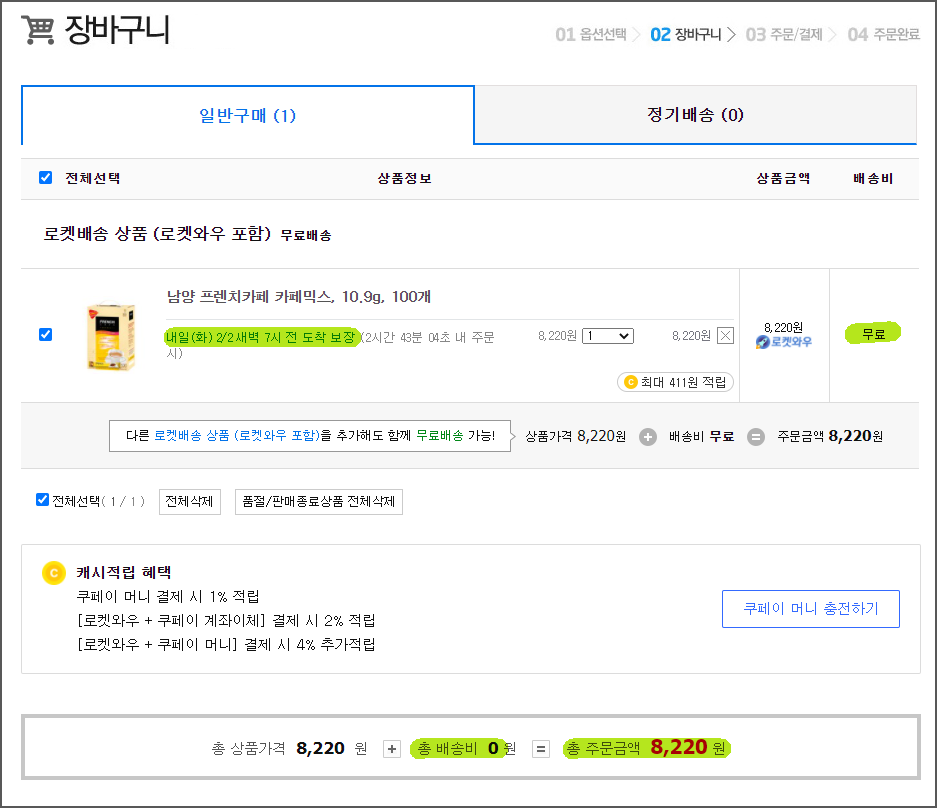 아래 장바구니 내용을 보면 주문 다음날 새벽배송이고