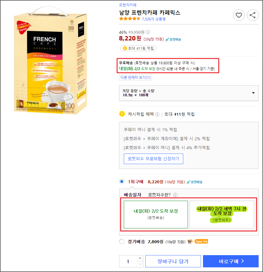 2/2도착보장(로켓배송), 2/2 7시전 도착보장(로켓와우)