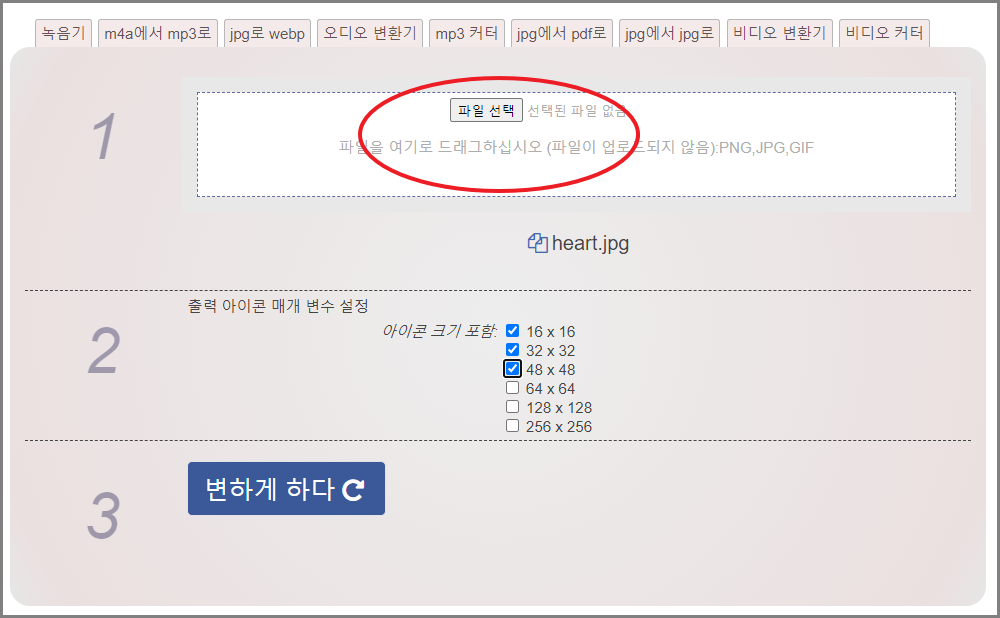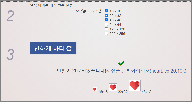 파일을 등록하고 2번에서 변환할 아이콘파일의 크기를 선택할 수가 있는데요!