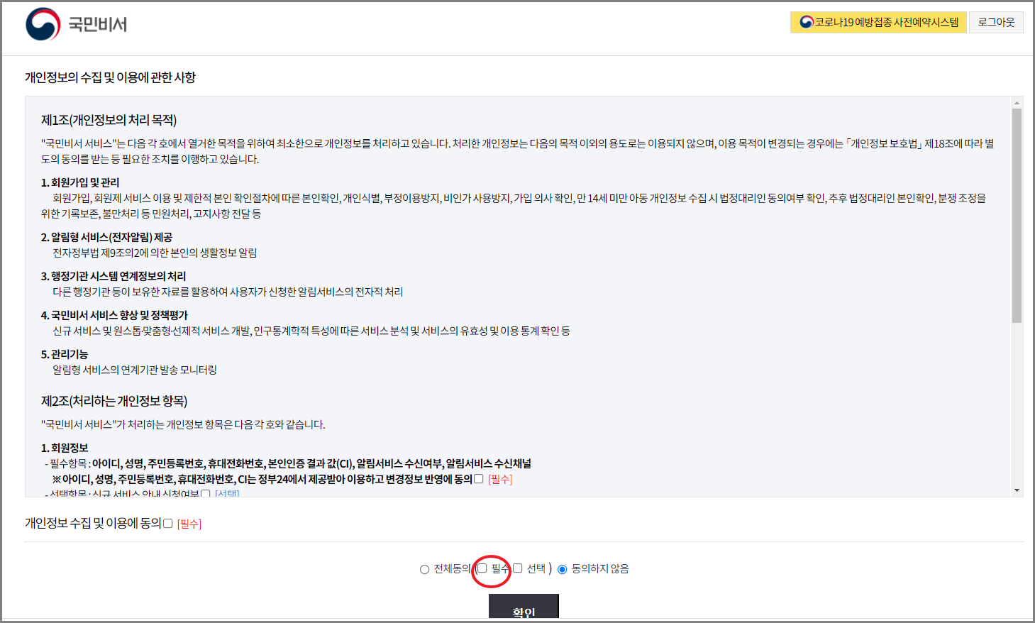 선택은 누를 필요없고 필수에 체크하고 확인을 누릅니다.