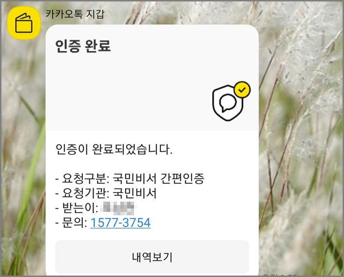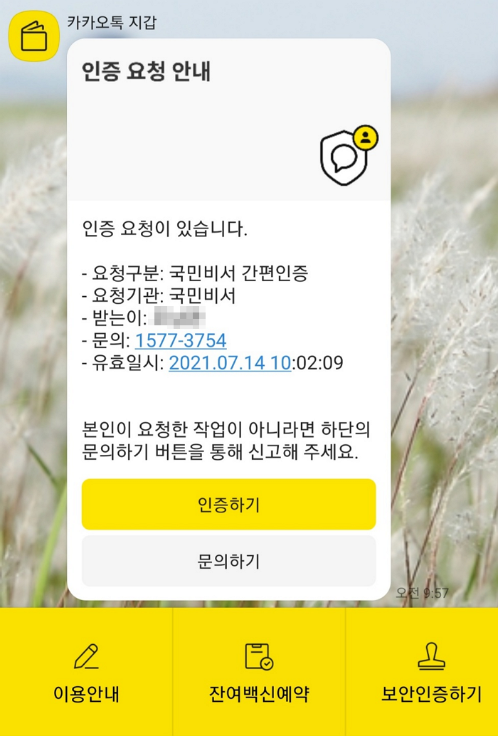 아래는 카카오톡 지갑으로 인증요청이 온 내용입니다.