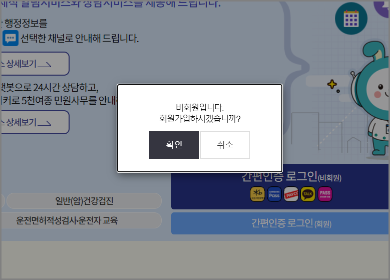 간편인증로그인(비회원)을 누르면 아래와 같이