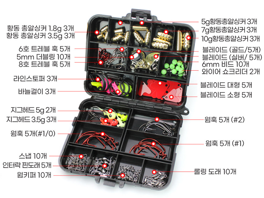 싱커, 바늘, 지그헤드, 비드, 도래류까지 모든 소품이 포함되어 있습니다.